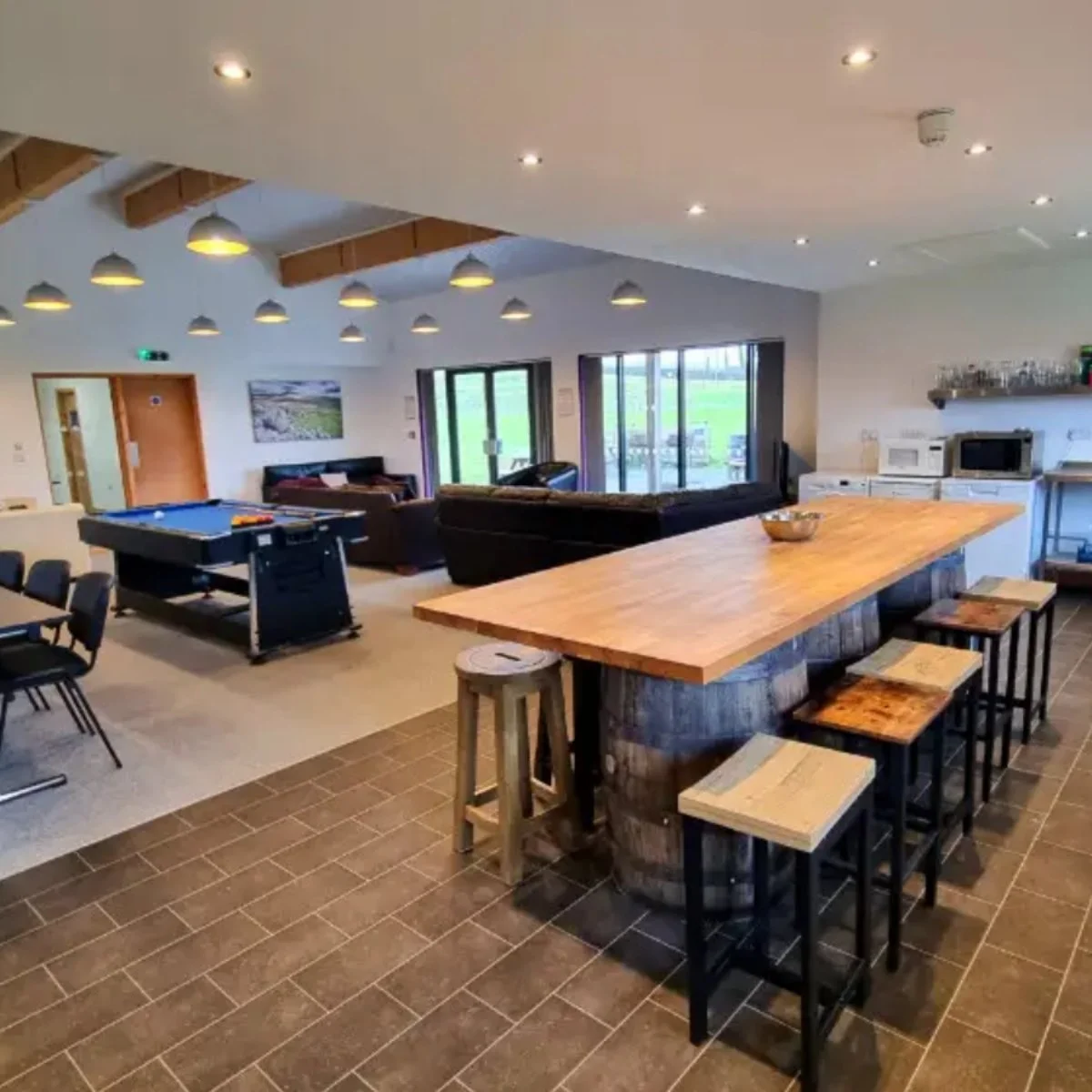 Flexible spaces for lessons, games, and relaxing together as a group.